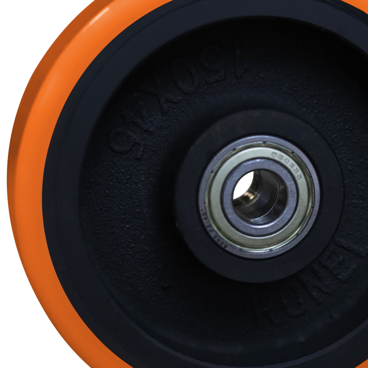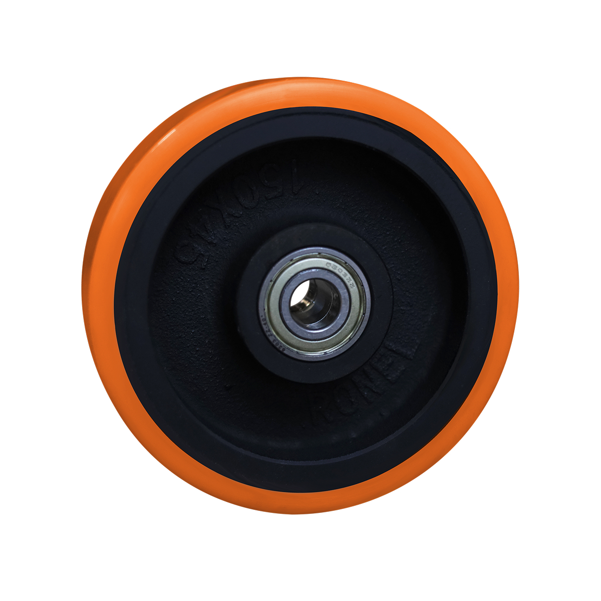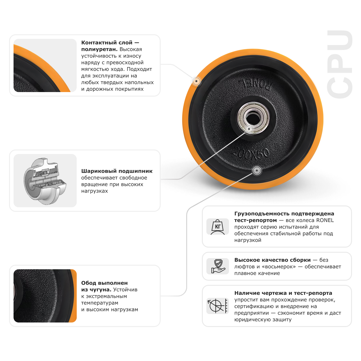 RONEL CPU 125 — большегрузное колесо, предназначенное для тележек, крупногабаритного промышленного оборудования, станков и т. п. Обод в модели изготовлен из чугуна, контактная поверхность — из полиуретана. Такое сочетание материалов гарантирует высокую прочность, долговечность и устойчивость к износу даже при интенсивной эксплуатации. Колесо выдерживает нагрузку до 480 кг, демонстрирует устойчивость к порезам, ударным воздействиям и подходит для работы на полах с неровностями.