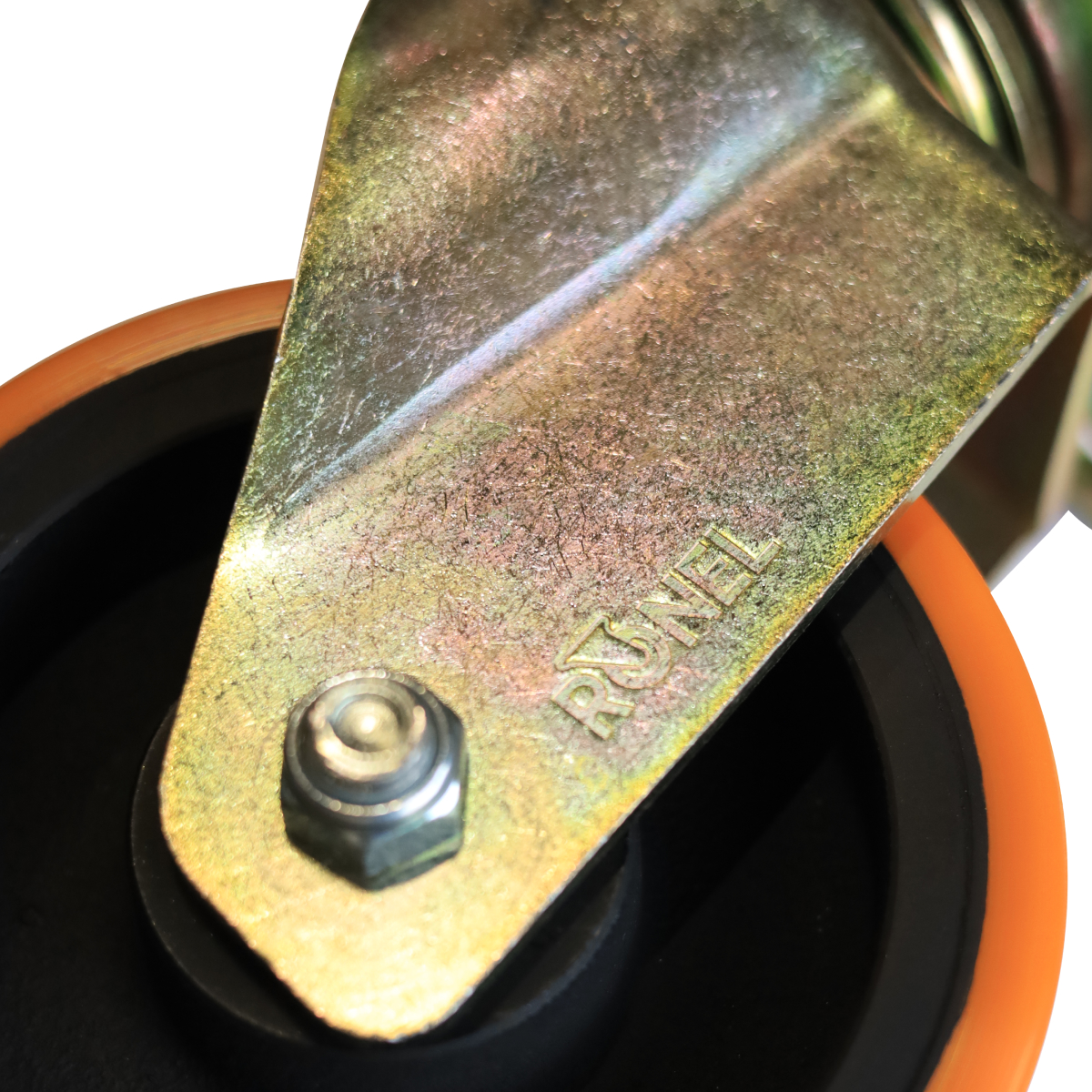 RONEL RN01 CPU 125 F — большегрузное колесо, предназначенное для тележек, крупногабаритного промышленного оборудования, станков и т. п. Обод в модели изготовлен из чугуна, контактная поверхность — из полиуретана. Такое сочетание материалов гарантирует высокую прочность, долговечность и устойчивость к износу даже при интенсивной эксплуатации. Кронштейн у данного колеса поворотный, изготовлен из оцинкованной стали, предусмотрен тормозной механизм.