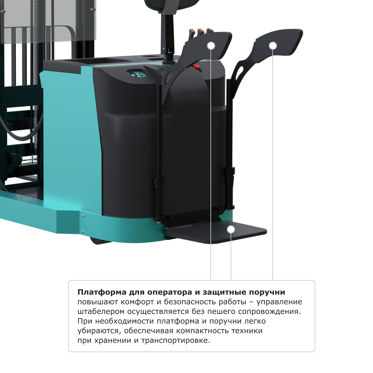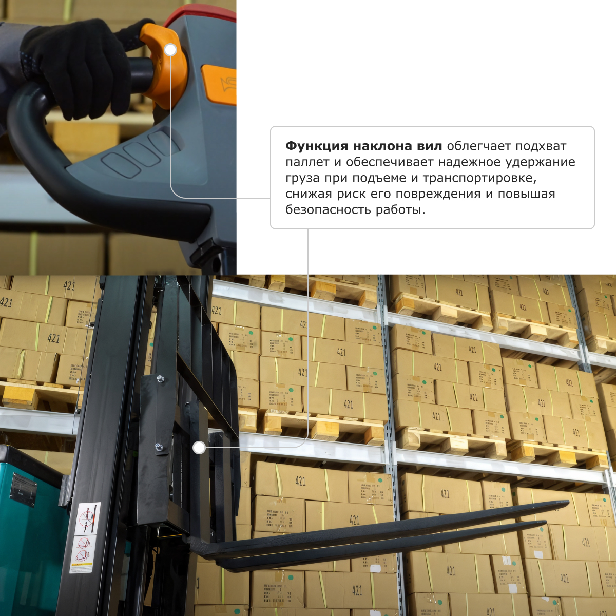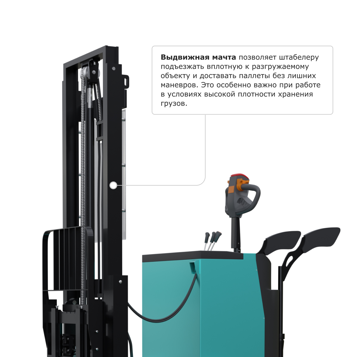 Функция бокового смещения вил. Функция свободного подъема вил. Возможна комплектация свинцово-кислотной батареей. За подробностями обращайтесь к нашим менеджерам.