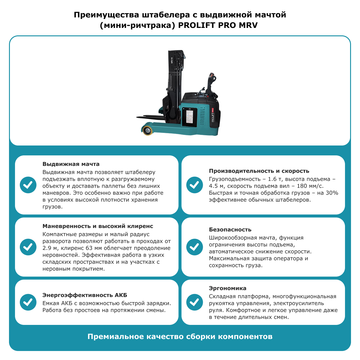 Штабелер MRV1645 относится к профессиональной линейке складской техники PROLIFT PRO. Вилы имеют раздвижную конструкцию, что позволяет работать с разными видами поддонов. Возможность выдвижения вил до конца опорных консолей значительно облегчает процесс погрузочно-разгрузочных работ — достигается более точное позиционирование грузов, становится возможным подъехать вплотную к разгружаемой технике или стеллажу.