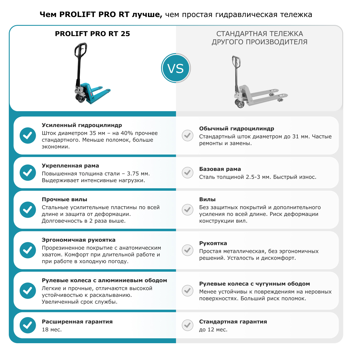 Гидравлическая тележка RT25-1150x550-P/P премиум-класса произведена в соответствии с новыми стандартами оценки качества складской техники. Модель новой серии PROLIFT PRO выделяется повышенным качеством материалов, улучшенной эргономичностью и производительностью. Компактная тележка оснащена усиленными вилами и рамой, подкатными роликами для увеличения маневренности. Грузоподъемность составляет 2500 кг.