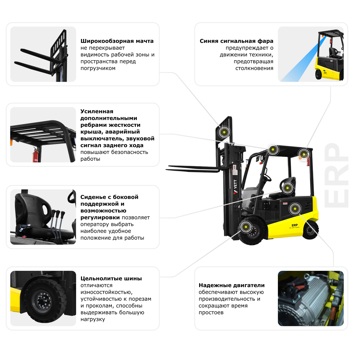 Электрический погрузчик YETT ERP20 li-ion ZSM550-SS оборудован необслуживаемыми двигателями мощностью 7700 Вт (подъема) и 7500 Вт (движения). Электродвигатели не вырабатывают выхлопные газы, что позволяет использовать технику в закрытых помещениях неограниченное количество времени. Литий-ионная АКБ емкостью 350 Ач обеспечивает длительную автономную работу. Высота подъема вил составляет 5.5 м, грузоподъемность — 2000 кг.