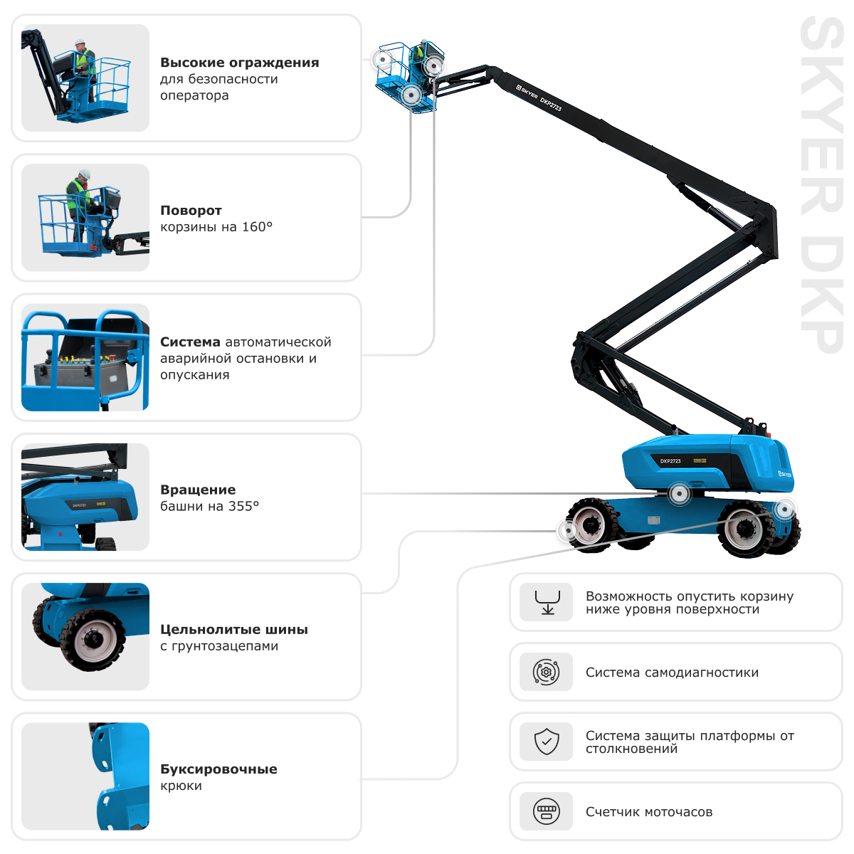 Дизельный коленчатый подъемник SKYER DKP2525 имеет компактные габариты. Рабочая высота составляет 25 м, грузоподъемность — 230 кг. Стрела с поворотным гуськом позволяет преодолевать препятствия и достигать труднодоступных мест. SKYER DKP2525 предпочтительнее использовать на открытых площадках, так как в процессе эксплуатации вырабатываются выхлопные газы. Для использования в закрытых помещениях требуется хорошая вентиляция.