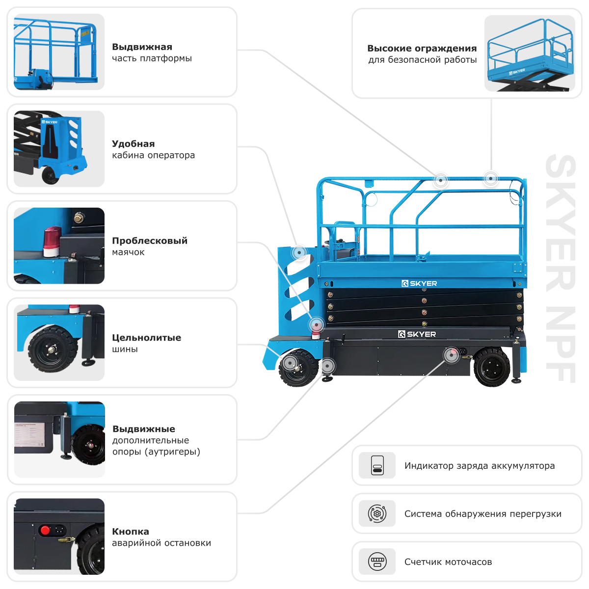 Самоходный ножничный подъемник NPF1403 бренда SKYER относится к современной, надежной строительной технике высокого качества. Устройство обладает грузоподъемностью 300 кг, используется при проведении монтажных/демонтажных, ремонтных, отделочных работ. Благодаря наличию тягового электродвигателя значительно повышается производительность техники. Емкость АКБ составляет 70 Ач. Кабина оператора с несъемным пультом управления делает работу оператора более комфортной. Подъемник востребован в складских комплексах, аэропортах, на объектах торговли.