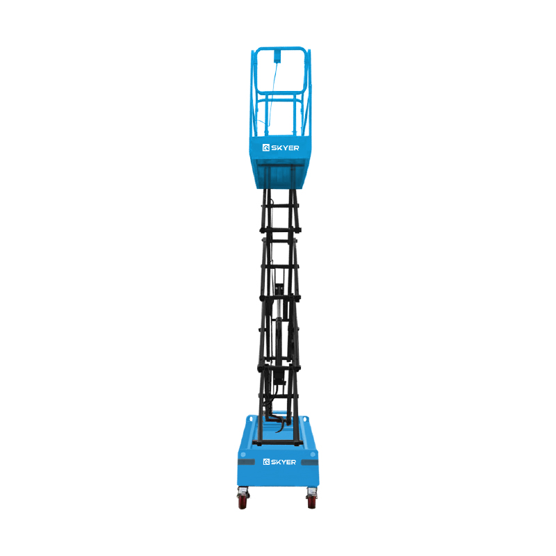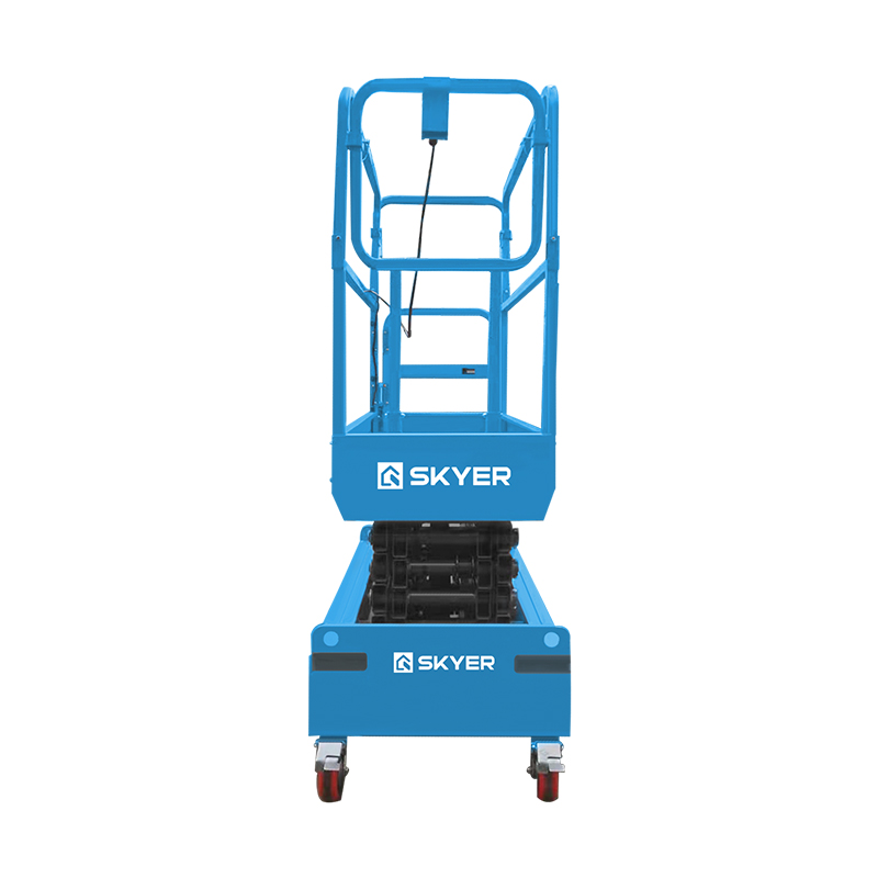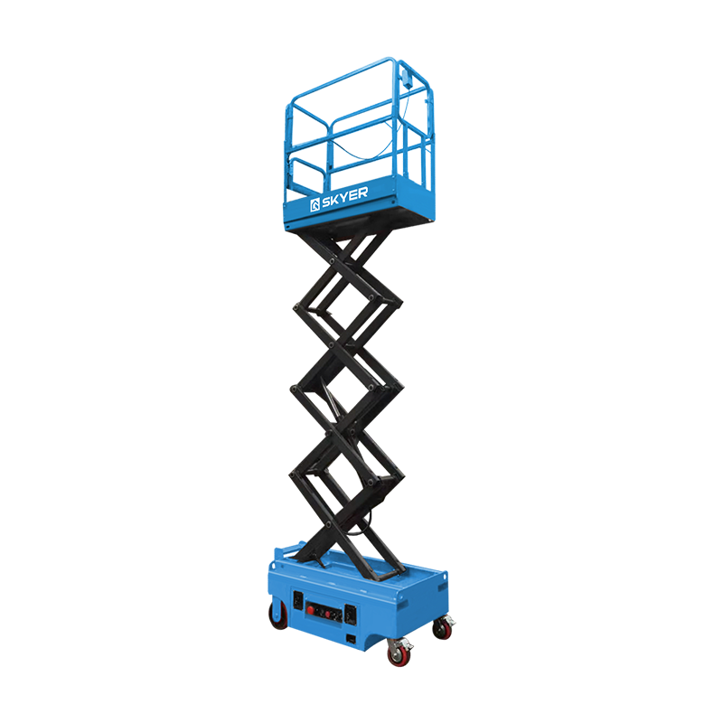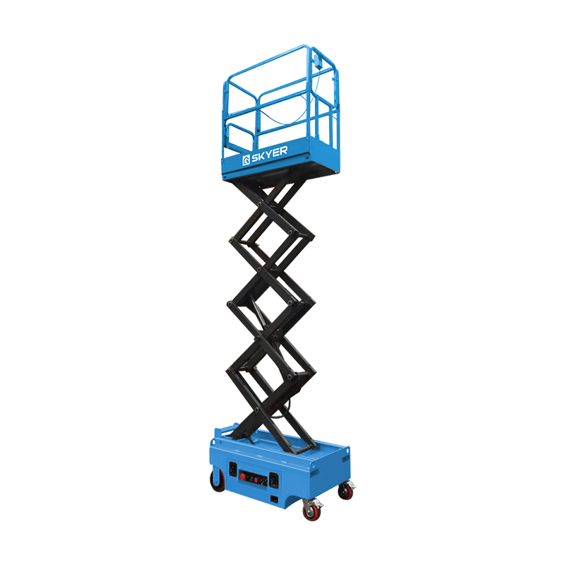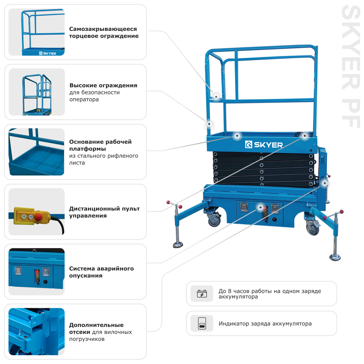 Ножничный подъемник PF0524 бренда SKYER выполнен из высокопрочной стали. Рабочая высота данной модели составляет 5 м, максимальная грузоподъемность — 240 кг. На подъемнике установлен электрический двигатель. Питание от аккумуляторной батареи, полное отсутствие выбросов и тихое перемещение делают эту технику безвредной для окружающей среды. Емкости батареи достаточно для полноценной эксплуатации в течение всей рабочей смены. Для обеспечения безопасности при высотных работах подъемник оснащен кнопкой аварийной остановки, системой аварийного опускания, самозакрывающимся торцевым ограждением платформы.