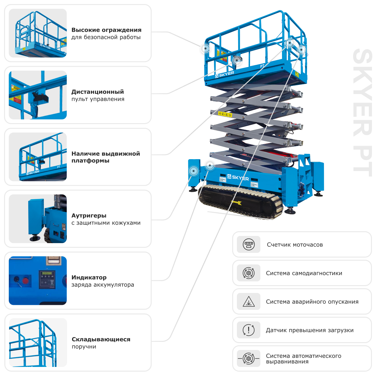 Подъемник самоходного типа PT1232 смонтирован на гусеничном шасси, что значительно расширяет возможности передвижения по неровным и нестабильным поверхностям. Надежный шарнирно-рычажный подъемный механизм обеспечивает плавное поднятие и опускание платформы. Грузоподъемность данной модели составляет 320 кг, высота подъема — 9.75 м. Благодаря компактной базе техника может работать даже в условиях ограниченного пространства.