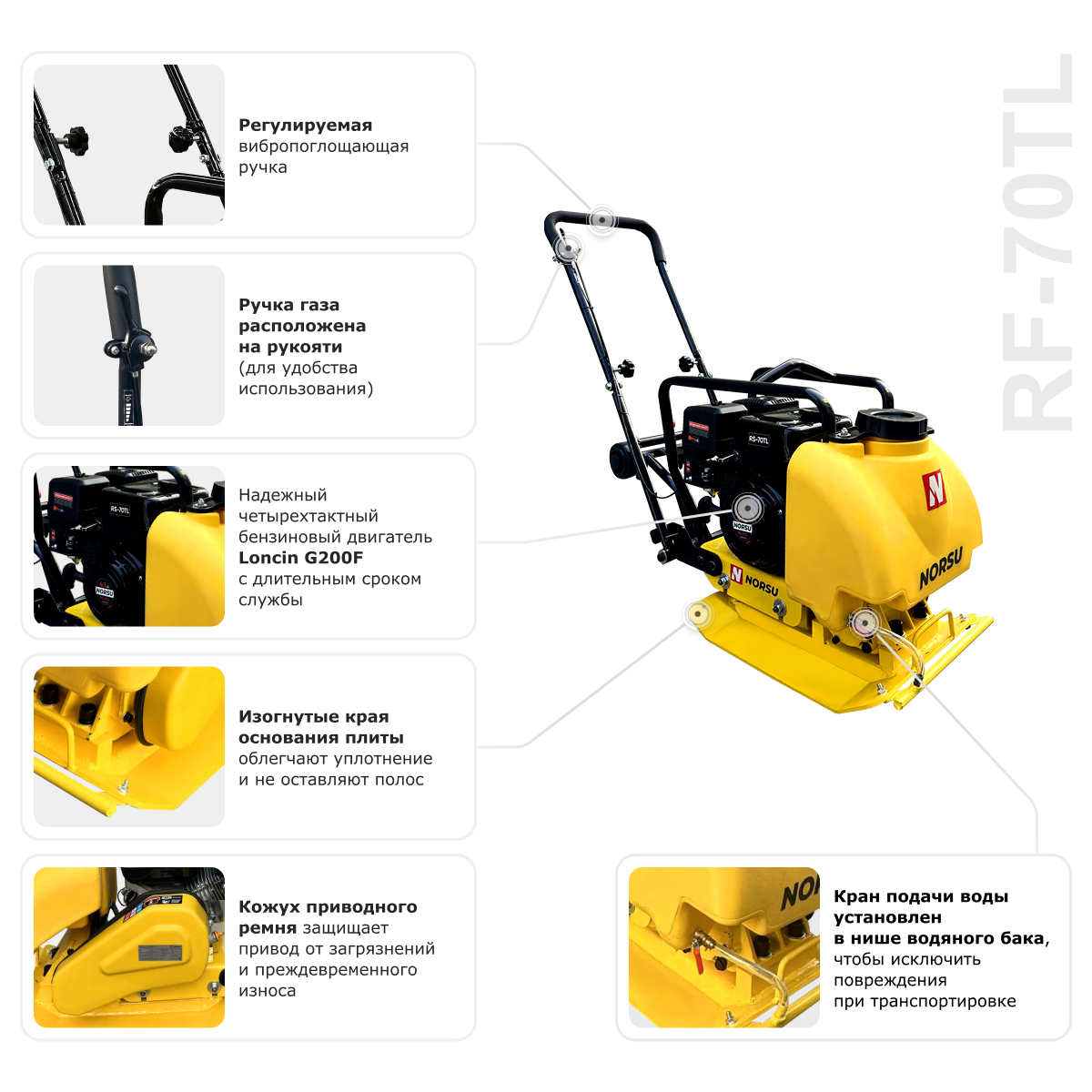 Виброплита NORSU RF-70TL используется для уплотнения различных видов грунтов и бетонных смесей, укладки асфальта и тротуарной плитки, заглаживания бетонных поверхностей. Небольшие размеры позволяют использовать технику в условиях ограниченного пространства (участки вдоль фундаментов и стен, траншеи). Глубина уплотнения составляет 200 мм, объем топливного бака — 2.5 л. В комплектацию входят бак для воды и колесный комплект.