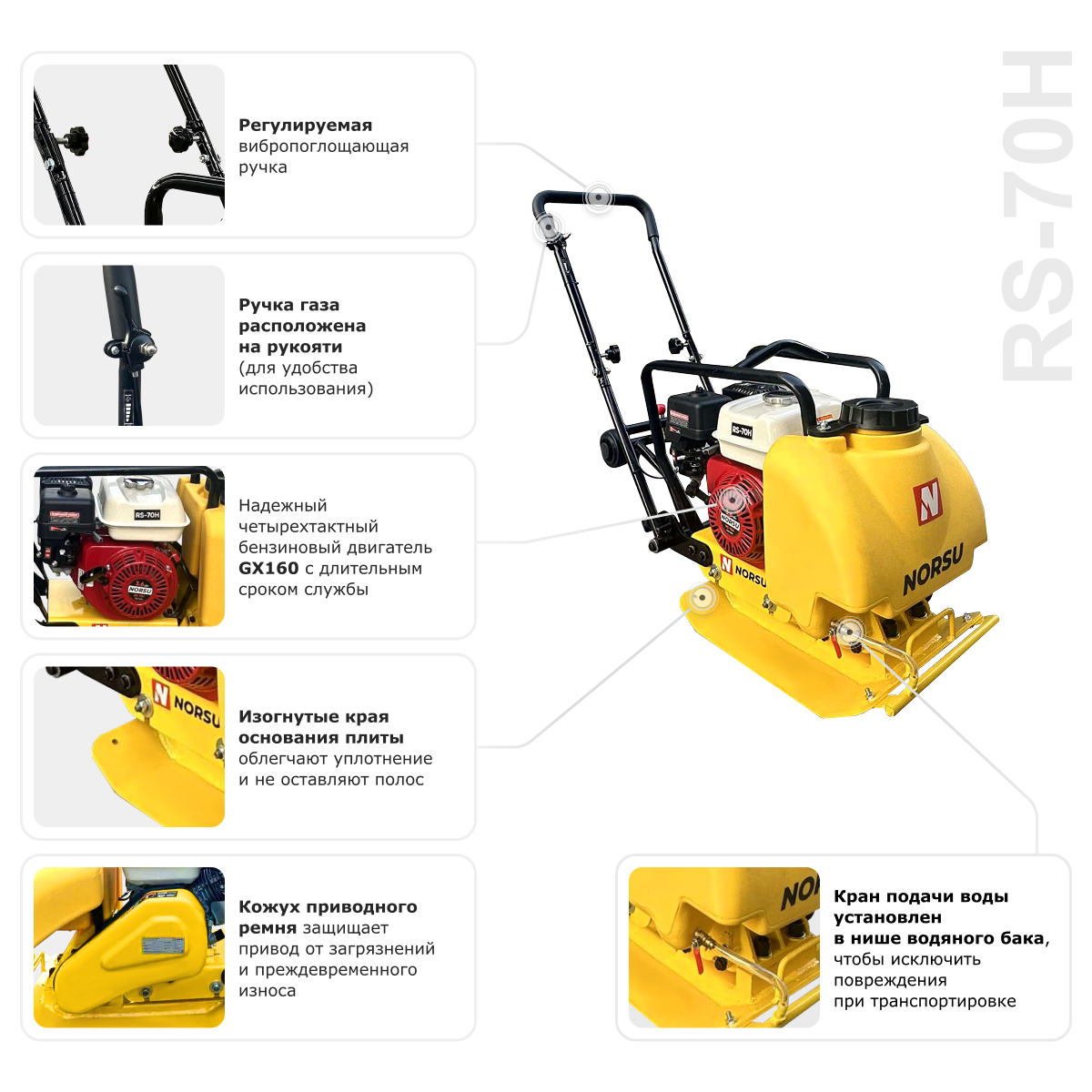Виброплита NORSU RS-70H представляет собой прямоходную модель с износостойким литым основанием, изготовленным из высокопрочного сплава. Используется для уплотнения различных видов грунтов, укладки тротуарной плитки (в этом случает нужно дополнительно приобрести полиуретановый коврик). Наличие оросительной системы расширяет функционал техники — возможно применение при укладке асфальта. Объем топливного бака составляет 3.1 л.