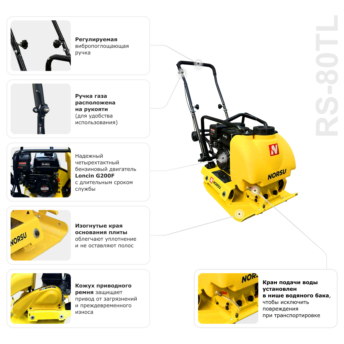 Виброплита RS-80TL бренда NORSU — это прямоходная модель, которая используется для работ, связанных с уплотнением грунтов и дорожных покрытий (асфальта, брусчатки). В конструкцию входит бак для воды. Техника востребована при прокладке инженерных коммуникаций, выполнении строительных и дорожных работ, благоустройстве территорий. Модель мобильная — встроенные колеса позволяют выполнять перемещение виброплиты на нужный участок. Глубина уплотнения составляет 300 мм, объем топливного бака — 3.6 л.