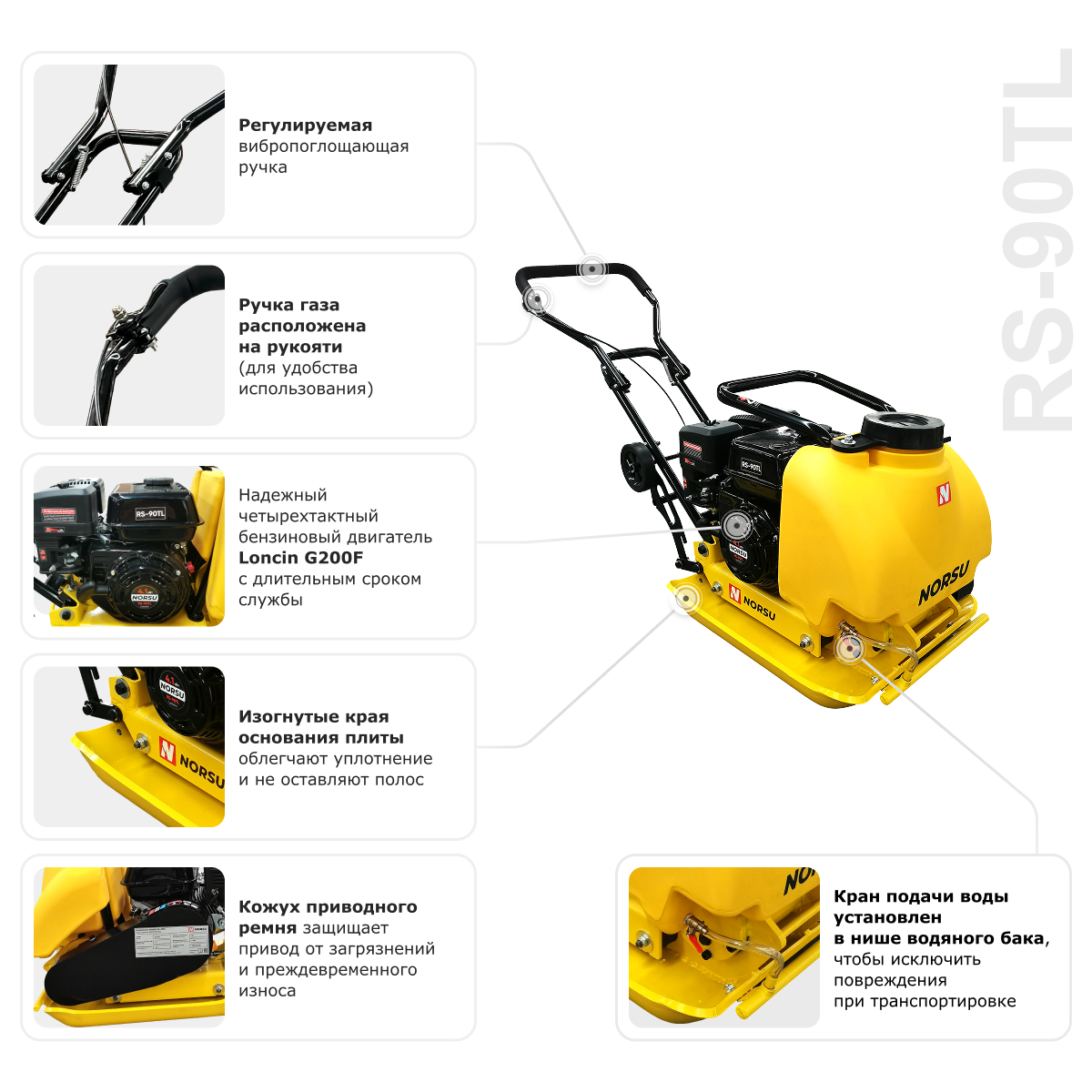 Виброплита RS-90TL бренда NORSU — это прямоходная модель, которая используется для работ, связанных с уплотнением грунтов и дорожных покрытий (асфальта, брусчатки). В конструкцию входит бак для воды. Техника востребована при прокладке инженерных коммуникаций, выполнении строительных и дорожных работ, благоустройстве территорий. Модель мобильная — встроенные колеса позволяют выполнять перемещение виброплиты на нужный участок. Глубина уплотнения составляет 300 мм, объем топливного бака — 3.6 л.