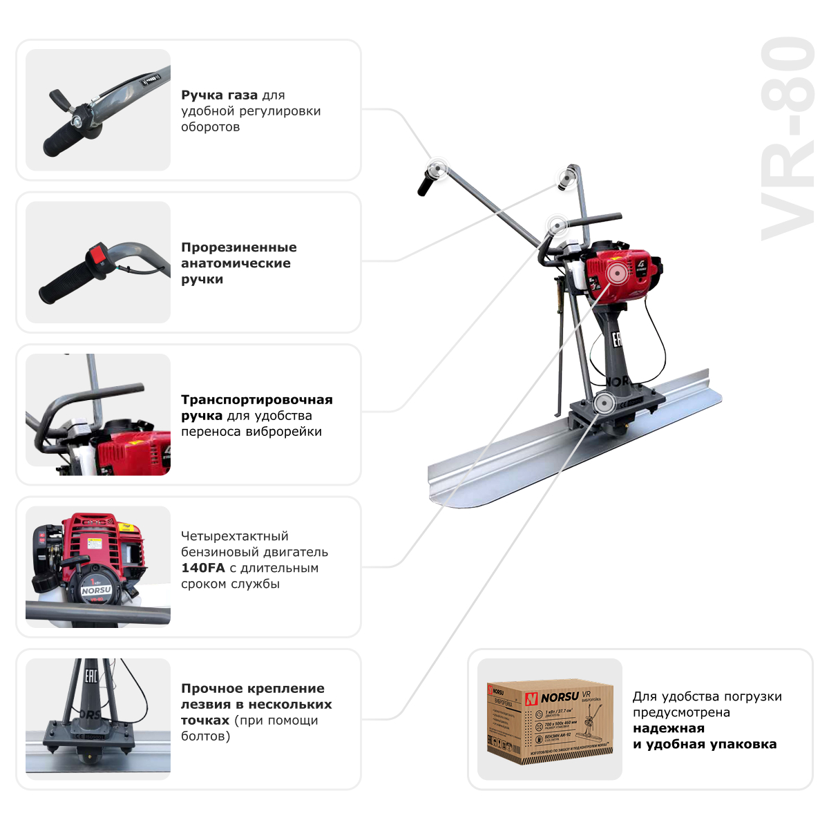 Бензиновая виброрейка NORSU VR-80 предназначена для выравнивания и уплотнения бетонных смесей. Вибрации равномерно распределяются по поверхности лезвия за счет его эргономичной формы. Модель надежная, компактная, удобная в эксплуатации. Наличие на раме опорной ножки позволяет защитить элементы управления от загрязнений. Оборудована бензиновым двигателем HUASHENG 140FA с объемом топливного бака 0.65 л.